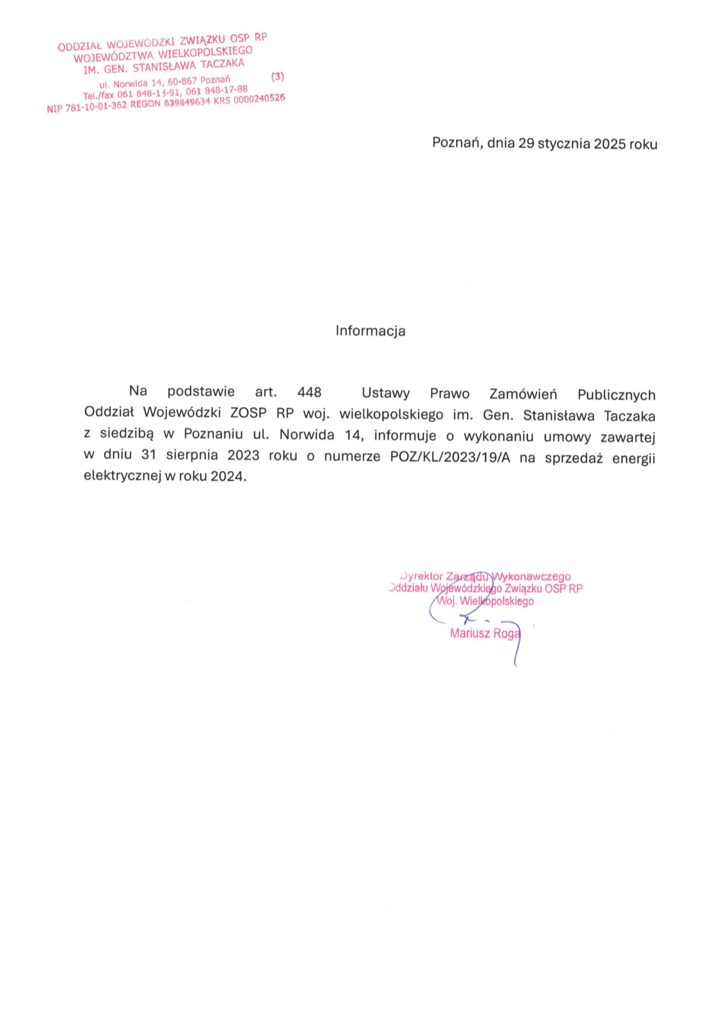 Informacja o realizacji umowy na sprzedaż energii elektrycznej w roku 2024